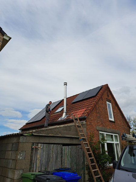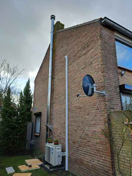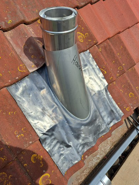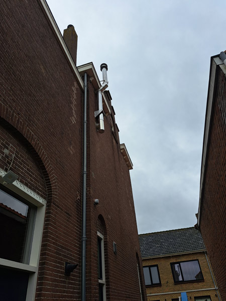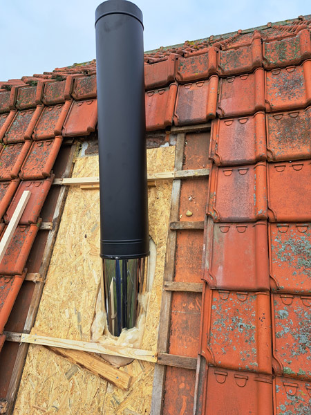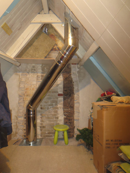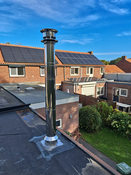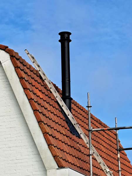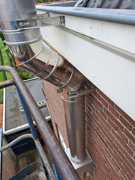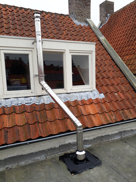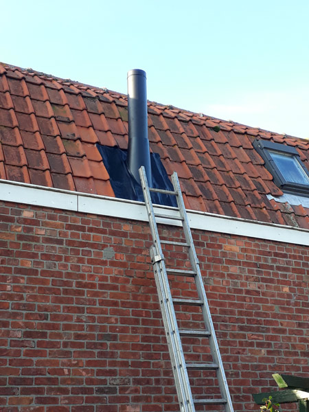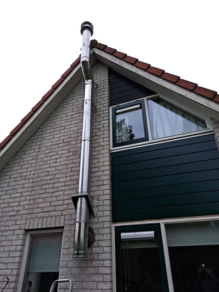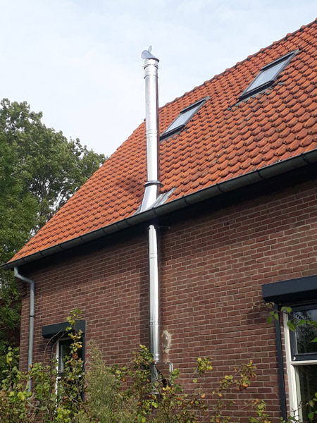 - Bij de aanleg van een rookgasafvoer door een bestaande schoorsteen en eventueel tegen een houten plafond, moet alles absoluut brandveilig gebeuren.